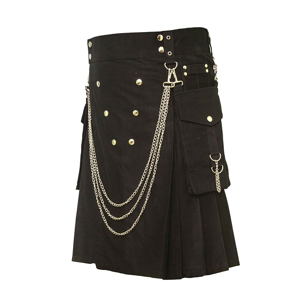 Crafted from durable black fabric that delivers a bold and edgy gothic aesthetic. Decorated with metal chains and studs for a striking, alternative fashion look. Features multiple utility pockets for practical storage and everyday convenience. Adjustable waist straps and buckles ensure a secure, customizable fit. Reinforced stitching adds strength and long-lasting durability. Pleated back design provides ease of movement while keeping the kilt’s structure. Heavy-duty hardware gives an authentic gothic-industrial feel. Perfect for gothic fashion lovers, festivals, concerts, cosplay, or standout streetwear.