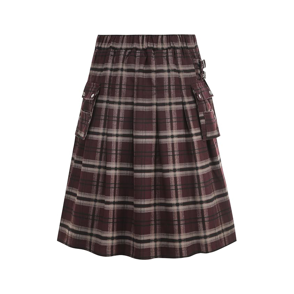 Features a stylish burgundy and beige plaid pattern with practical utility styling.