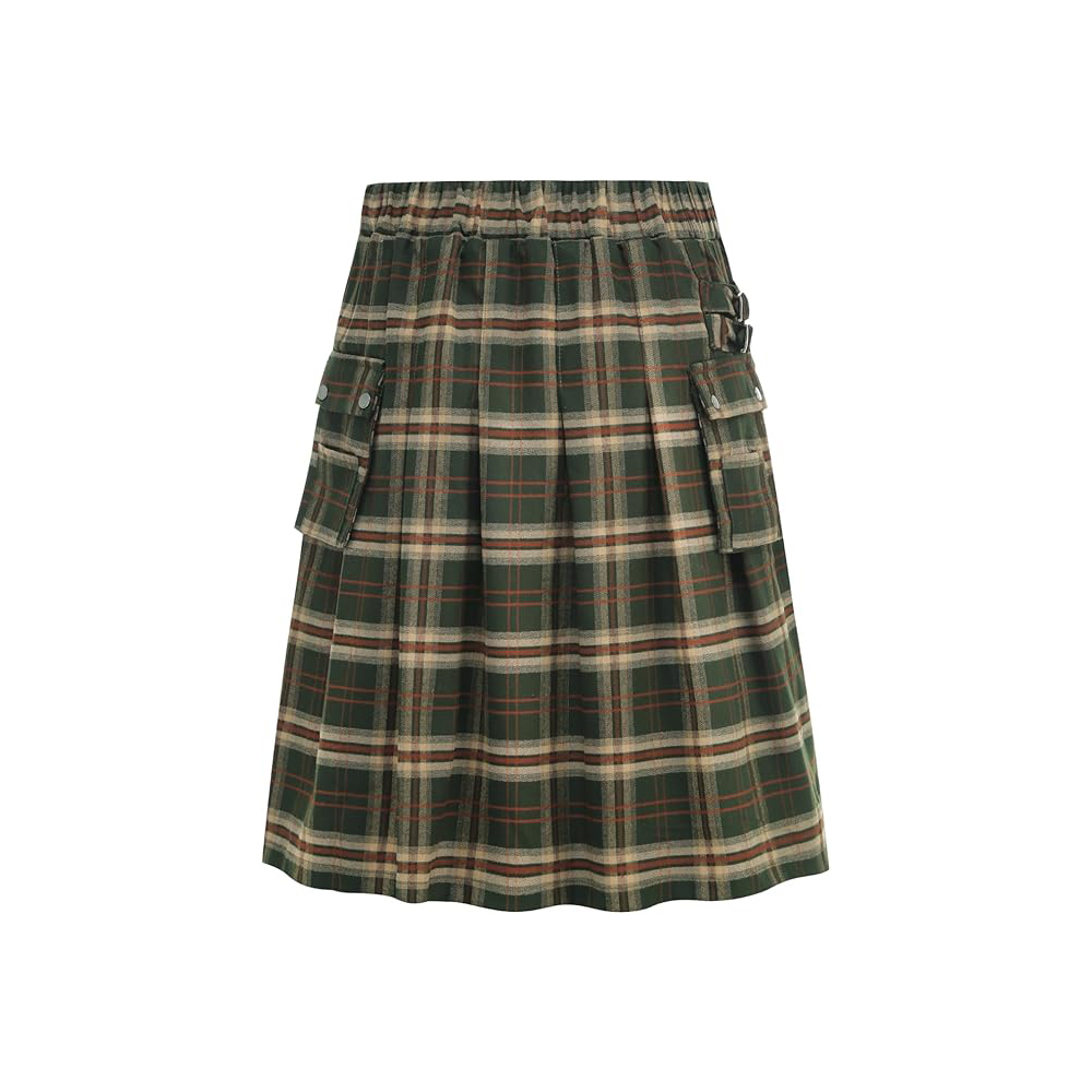Features a forest green and tan plaid pattern with practical utility styling.