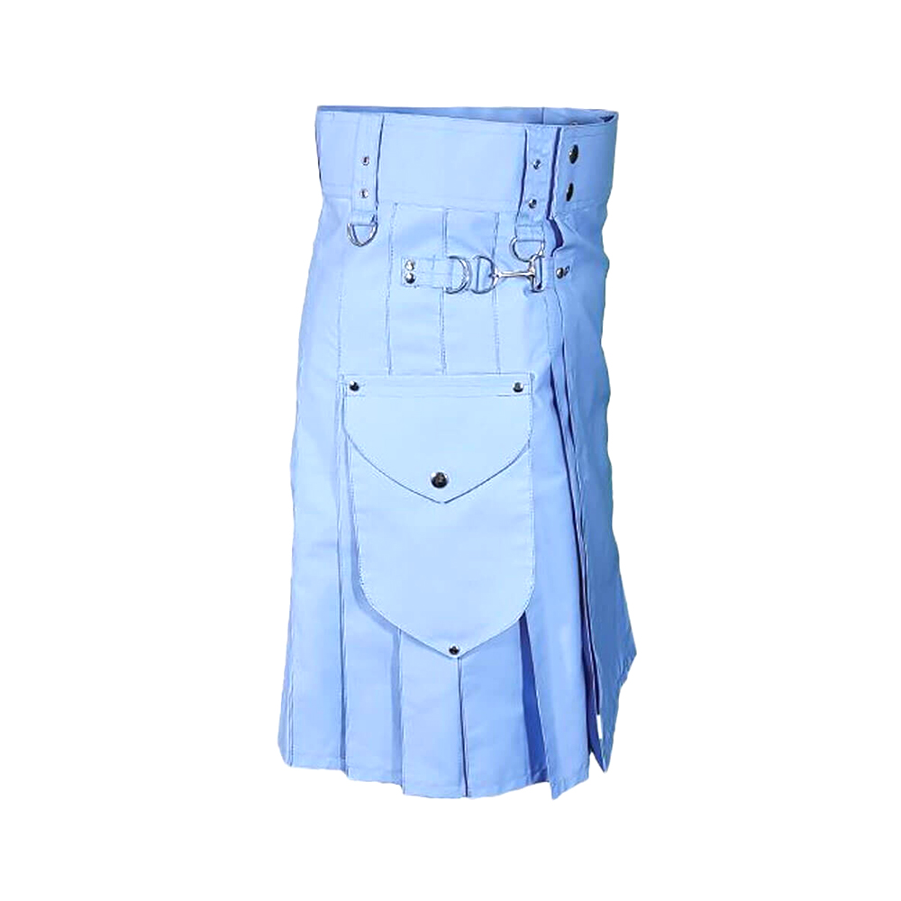 Made from high-quality, durable fabric for comfort and long-lasting wear. Features a fresh light blue color for a modern and stylish look. Equipped with multiple functional pockets for practicality and easy storage. Adjustable waist straps ensure a secure and comfortable fit. Reinforced pleats and stitching maintain structure while allowing ease of movement. Lightweight design makes it ideal for casual wear or active occasions. Suitable for festivals, cosplay, Highland-inspired fashion, or everyday style. Blends traditional kilt styling with contemporary utility and modern aesthetics